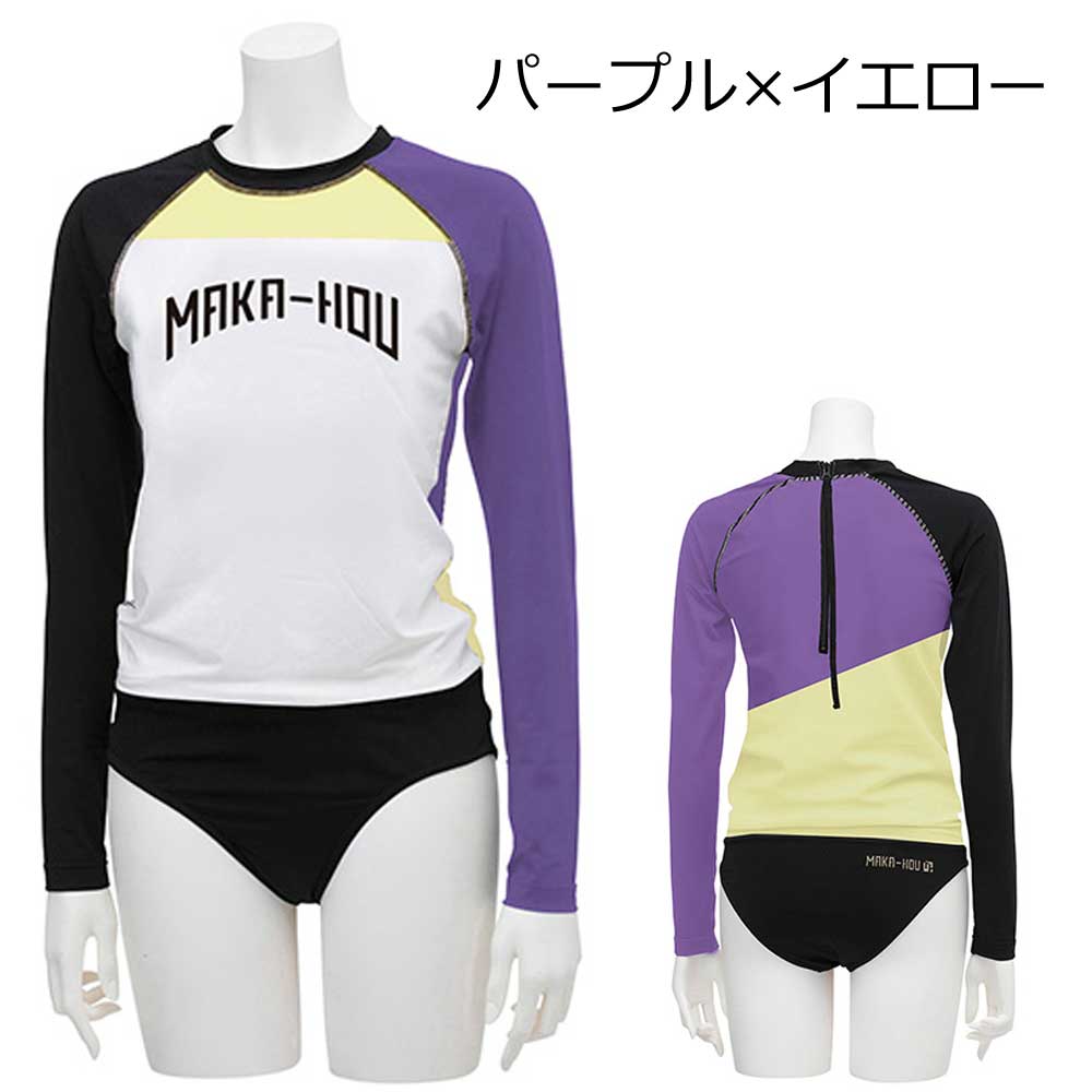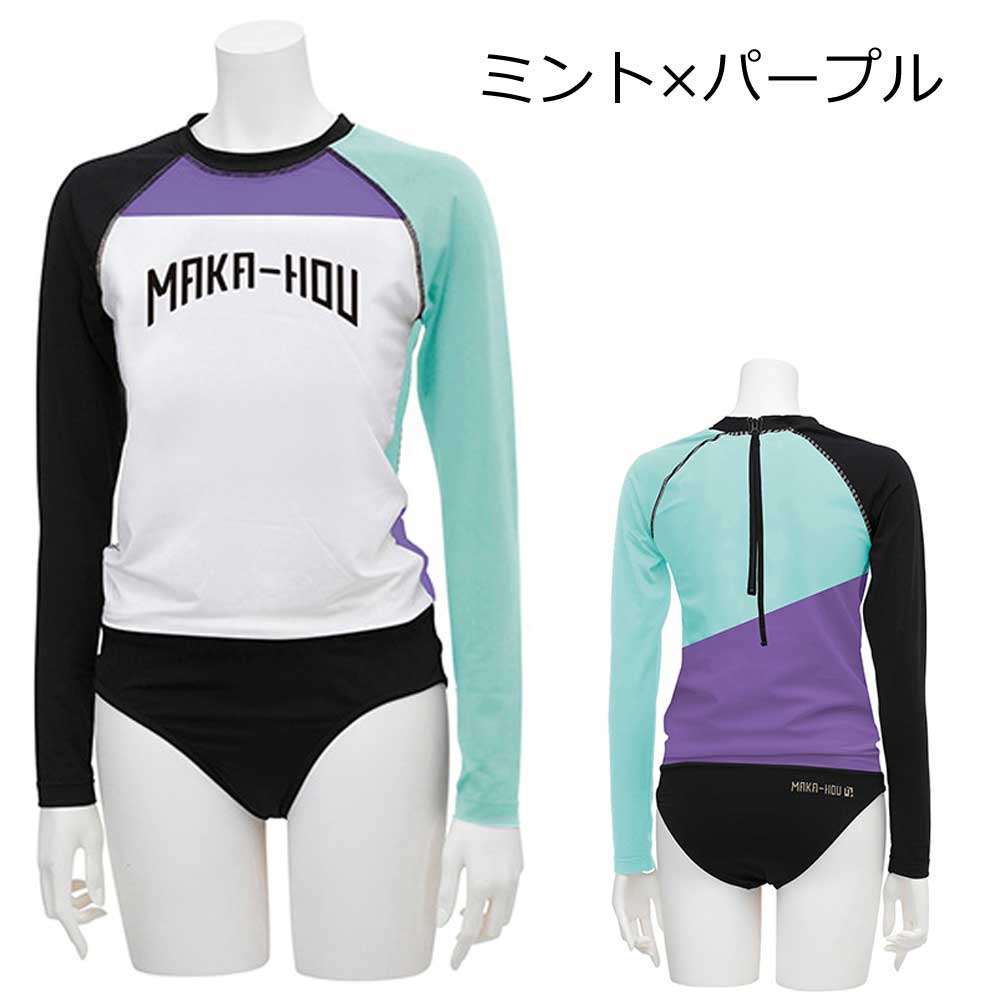 MAKA-HOU レディースラッシュガード Rash Gurad with Hot Pants 24W14/71S 【カラー】・パープル×イエロー ・ピンク×ブルー ・ミント×パープル 【素 材】Polyester 80% Polyurethane 20% 【サイズ】 M/身長150〜165cm バスト78〜86cm ウエスト61〜67cm ヒップ85〜91cm L/身長160〜175cm バスト82〜92cm ウエスト65〜73cm ヒップ85〜97cm ※個人差がありますので目安としてお考え下さい。