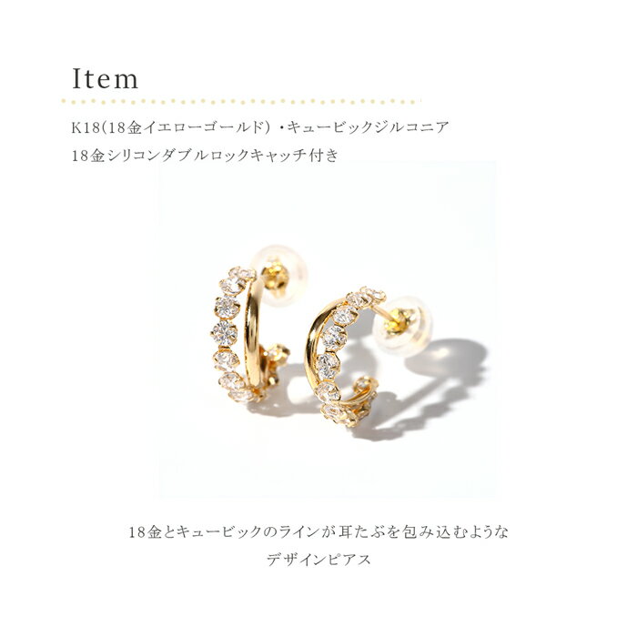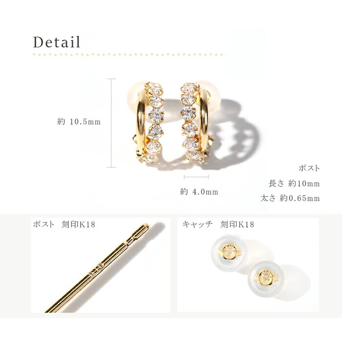 商品説明素材K18(18金イエローゴールド) 石キュービックジルコニア刻印 K18サイズタテ約10.5mm ヨコ約4.0mm ポスト 長さ約10mm 太さ約0.65mm付属品 GUARANTEEカード(品質保証書)ギフトBOXまたは専用ポーチ 一言コメント 半円形のフープ型。